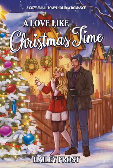 Entonces apareció Caleb, el gruñón dueño del café de Wayward Hollow, que trata cualquier cosa festiva como si fuera una enfermedad contagiosa. Desafortunadamente para él, me dejó convencerlo (a la fuerza) de que montara conmigo un puesto de pan de jengibre para el Mercado Navideño.